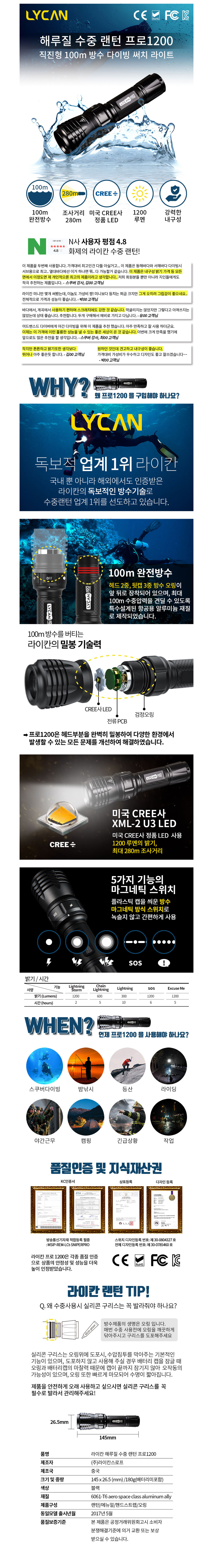 라이칸 프로는 기존 수중랜턴의 비싼 가격을 극복하고 가성비 높은 제품을 통해 현재 많은 사랑을 받는 메이커로 자리 잡았습니다. 처음 발매 되었을 때, 기존 수중랜턴의 1/4 정도 되는 합리적인 가격으로 사랑받고, 오랜기간 동안 검증을 거듭하며 이제는 가성비 높은 쓸만한 수중라이트(랜턴)이 되었습니다.