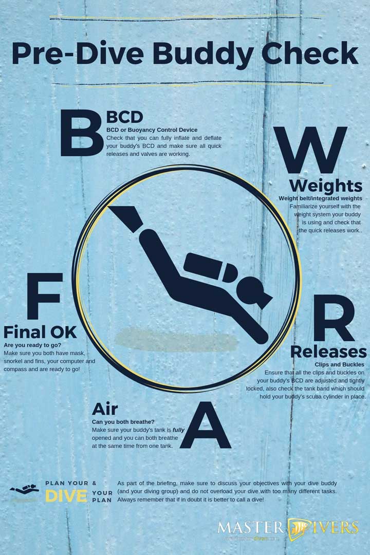 모든 장비를 착용 완료 한 뒤 (경우에 따라 마스크,스노클,핀은 예외) 다이빙 전 안전점검을 한다. 다이빙 전 안전점검을 쉽게 기억하기 위해 영어 문구를 만들어 외우기도 하는데 <<Begin With Review And Friend 항상 다이빙 전 안전점검을 실시하자>> 하지만 BWRAF를 기억 할 수만 있다면 어떤 문구라도 괜찮다. 예전에 태국 꼬따오에서 강사 생활 할 때 외국 강사들은 BWRAF를 < Big White Rabbits Are Fluffy 크고 흰 토끼는 털이 복실복실해 > 로 설명하던 모습이 기억난다. 굉장히 인상적이었다. 저렇게 외우기 쉽게 강사들이 설명하려는 노력은 참 보기 좋다. 재미와 안전 두가지 모두를 얼마든지 잡을 수 있다.